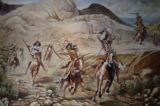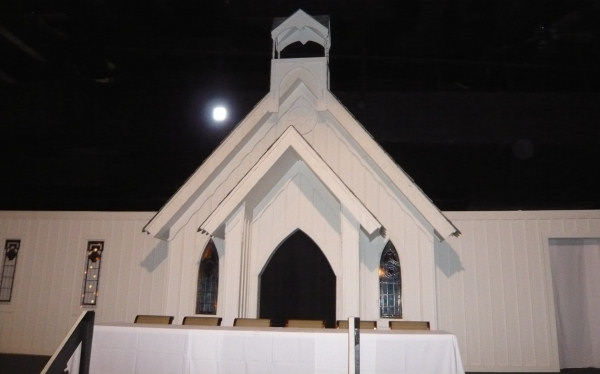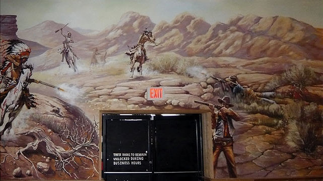 This was a challenging, large-scale project to create several different scenes using mostly trompe l'oeil techniques. For the Alamo, cafe, and store front sets I created the designs to project onto the walls and assisted in painting and construction. I worked extensively on the Western mural which covered the entire wall where the entrance was located, as well as the construction of the church on the opposite wall.